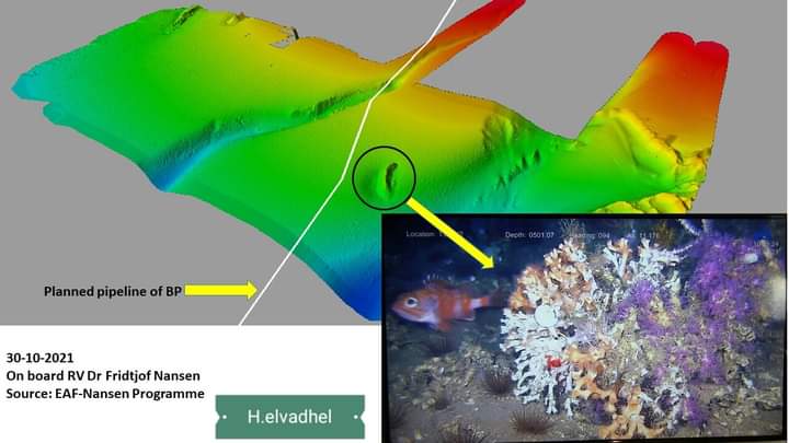تم قبل خمسة أيام على متن سفينة أبحاث المحيطات النرويجية د. فريدجوف نانسن، من خلال مركبات تعمل عن بعد في أعماق البحر ROV، اكتشاف تشكيلة جديدة من الشّعاب المرجانية في المياه الموريتانية العميقة Cold-water coral ، على عمق 500 مترا، وبطول 600 مترا وبارتفاع 60 مترا، وذلك على بعد أمتار قليلة من المكان المُتوقّع لمرور خطوط أنابيب الغاز لشركة بريتش بتروليوم.